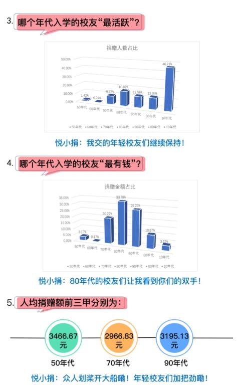 捐赠人数“最活跃”的校友主要集中于10年代入学的校友,比例为46.21%,其次为80年代和00年代入学的校友,占比分别为16.82%和13.03%,捐款人群整体呈年轻化趋势。而人均捐款额前三甲分别为:90年代(3195.13元)、50年代(3466.67元)、70年代(2966.83元)。这些数据一定程度上体现出校友的责任担当意识和奉献精神。