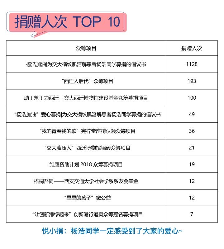 捐赠人次最多的一天为2019年1月28日,共508人次;捐赠金额最高的一天为2018年12月11日,当日捐赠金额总数为40046元。“助(筑)力西迁—交大西迁博物馆建设基金众筹募捐项目”是思源悦捐网上线项目中累积捐赠金额最多的项目,为684912元。捐赠人次最多的项目为“杨浩加油|为交大横纹肌溶解患者杨浩同学募捐”,共1178人次。