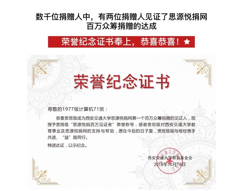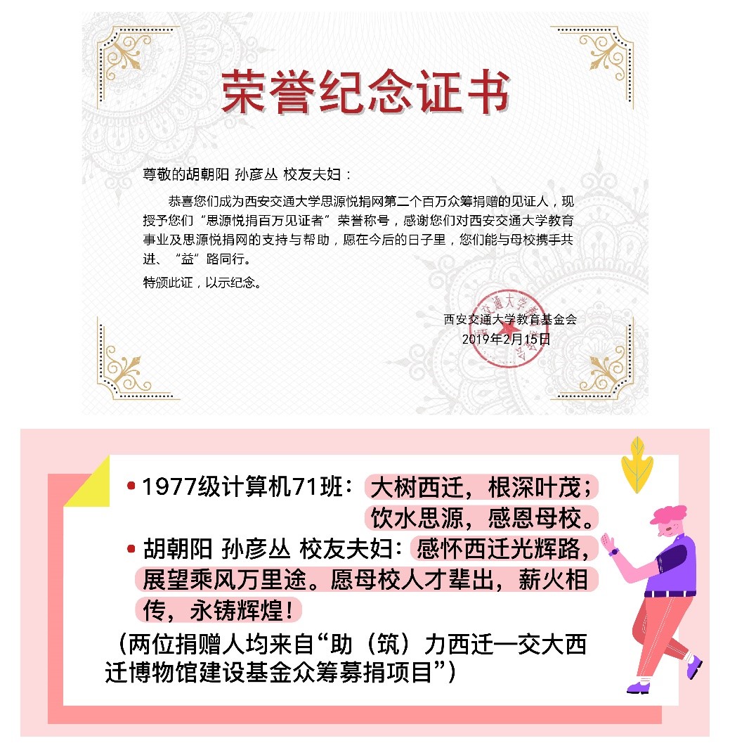 在参与众筹捐款的数千位捐赠人中,有两位捐赠人见证了思源悦捐网百万众筹捐赠的达成,他们是1977级计算机71班的校友和胡朝阳、孙彦丛校友夫妇。两位捐赠人均来自“助(筑)力西迁—交大西迁博物馆建设基金众筹募捐项目”。胡朝阳、孙彦丛校友夫妇表示:“感怀西迁光辉路,展望乘风万里途。愿母校人才辈出,薪火相传,永铸辉煌。”