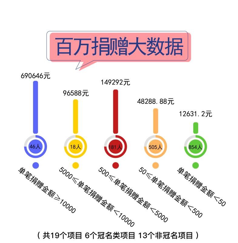 单笔捐赠金额超过10000元的为46人,占比2.87%,共690646元;5000到10000元的为18人,占比1.12%,共96588元;500到5000的为181人,占比11.28%,共149292元;50到500的为505人,占比31.48%,共48288.88元;低于50元的为854人,占比53.24% ,共12631.2元。(以上数据均为第二个百万捐赠额捐赠数据,不包括第一个百万捐赠额捐赠数据。)