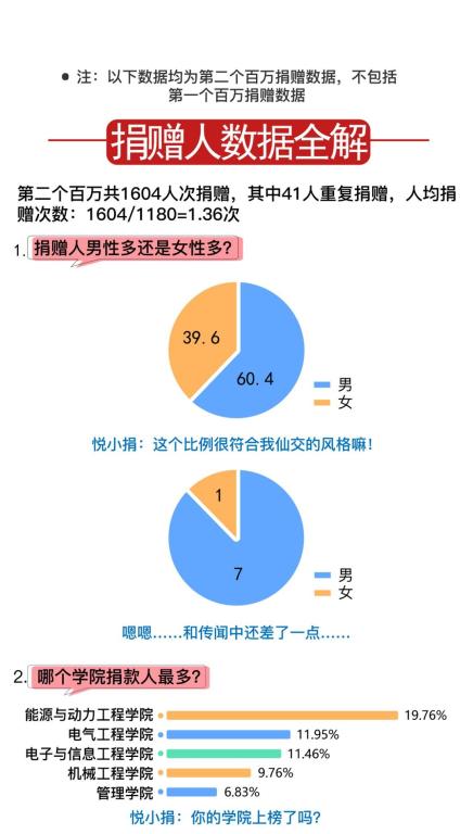 捐赠人数男性占比60.4%,女性占比39.6%,男女比例为7:1。捐赠校友来源最多的五个学院分别为能源与动力工程学院、电气工程学院、电子与信息工程学院、机械工程学院、管理学院。