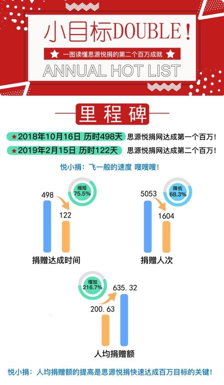 思源悦捐网是由西安交通大学教育基金会开发建立、管理、运营的开放式的网络众筹服务平台,继2018年10月16日思源悦捐网成立一周年之际众筹总额首次突破百万大关,历时122天后,在校友、在校师生及各界爱心人士的大力支持下,2019年2月15日,思源悦捐网筹款总额成功突破二百万。与第一个一百万目标达成历时489天相比,第二个一百万目标达成时间缩短75.5%。第二个百万捐赠人数为1604,其中有41人重复捐赠,人均捐赠次数为1.36次。人均捐赠额由之前的200.63元上升至635.32元,增加216.7%。
