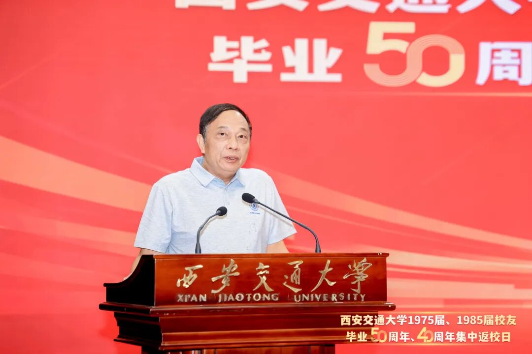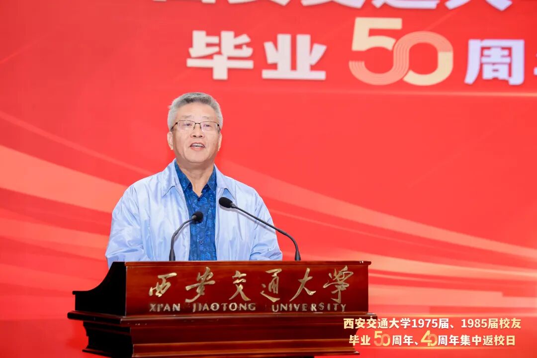 老教师代表、西迁老教授朱继洲深情回顾了自己的西迁历程。他表示,近七十年来,一代代交大人始终以“爱国奋斗”为精神底色,用实际行动践行着“扎根西部、服务国家、世界一流”的使命担当,将青春与智慧无私奉献给这片热土。他寄语广大校友,要持续传承和弘扬西迁精神,以国家需求为己任,让西迁精神的火炬在新一代交大人手中接力传递,照亮前行之路。在服务国家现代化建设的伟大事业中,彰显交大人新担当,共同为学校发展和民族复兴贡献力量。