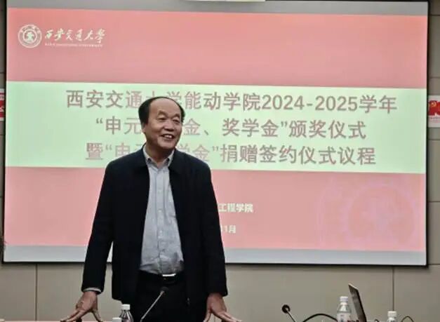 11月29日,2025年“申元奖教金、奖学金”颁奖仪式暨“申元奖学金”捐赠仪式举行。西安交通大学1985届压缩机专业校友、沈阳申元气体压缩机有限责任公司董事长赵东升,沈阳申元自动化科技有限公司总经理刘昶志,西安交通大学能动学院党委副书记韦娜,教育基金会秘书长助理、项目管理部部长毛珊,压缩机工程系主任何志龙教授及企业骨干、教师代表、获奖学生等出席仪式。仪式由能动学院吴伟烽教授主持。