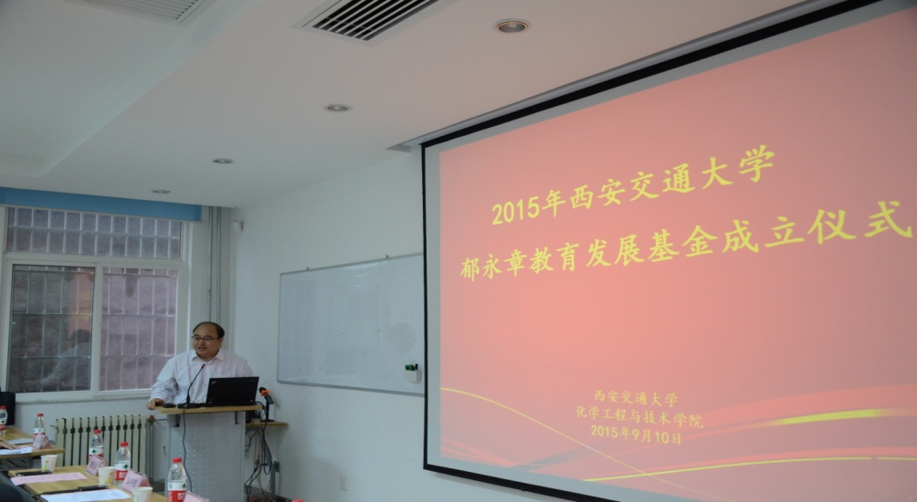 9月10日下午四点半,“郁永章教育发展基金”成立仪式在化工学院106会议室举行。仪式由化工学院郁永章教育发展基金管理委员会秘书长高秀峰副教授主持。郁永章教授及夫人汪又英女士,西安交通大学党委副书记宫辉,教育基金会秘书长赵卫滨,化工学院党总支书记张早校,化工学院执行院长魏进家及学院其他领导,上海好米工作技术有限公司刘沙工程师与来自全国各地的化工学院校友代表、化工学院师生近百人出参加成立仪式。