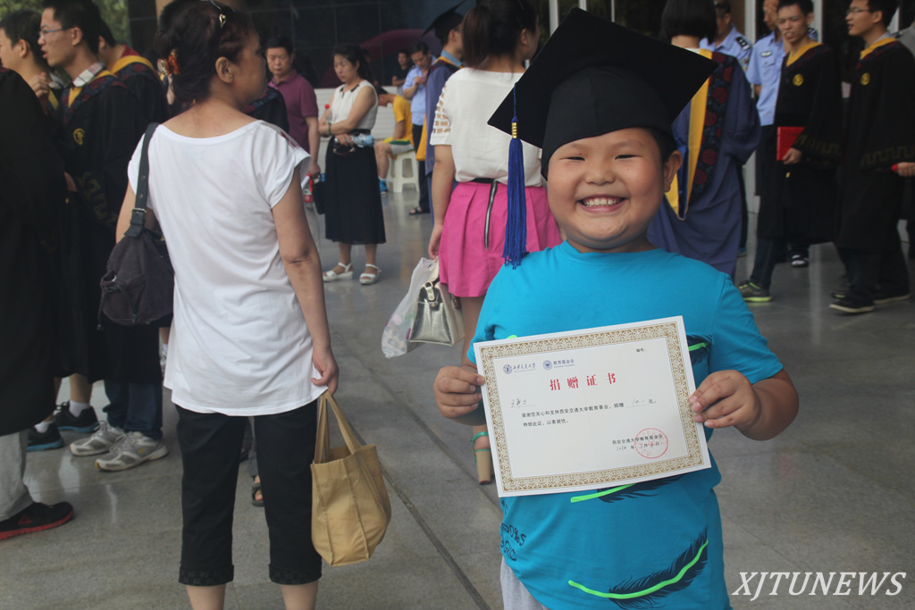 小男孩代表硕士毕业的父母捐款后高兴留念