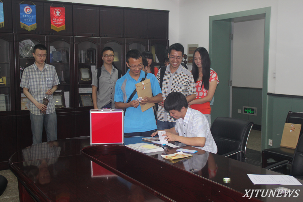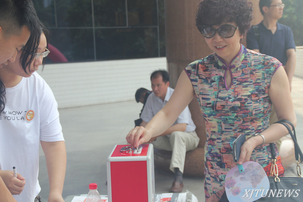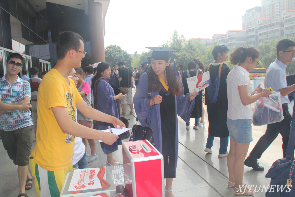 一对中年夫妇走向募捐箱投入了他们的捐款。他们说,儿子刚刚硕士毕业,正在参加毕业典礼,因此他们代表儿子捐一点钱。“我们的孩子在西安交通大学接受了七年教育,真的很感激交大,希望我们能尽一点微薄之力。”朴实而真挚的话语里饱含着对学校的一片深情。