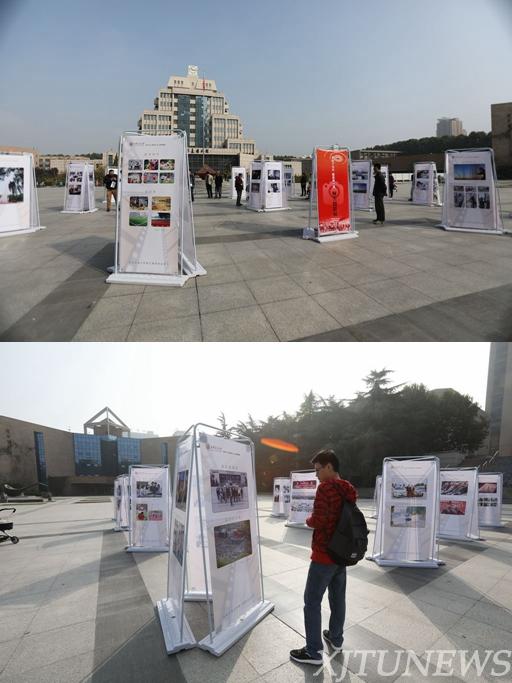 在四大发明广场,摄影展吸引了学校众多师生驻足观看。文治书院机械46班的杨楠仔细观看了现场的每一幅作品,并在交大的全景图前停下了脚步。望着全景图上的每一处风景,他心中泛起波澜:“校园的文化底蕴与磅礴气势令我备受震撼,看到这样的照片,我能够感受到学校改革的强大能量和崛起的巨大动力。作为一名学生,我将刻苦学习,与时俱进,为学校的进步贡献力量。”邵晓民是校工会的一名教工,他的作品入围了本次的摄影展。站在自己的作品前,邵晓民感慨地说:“中国西部科技创新港是西安交大的希望,也是西部崛起的希望。党的十九大已经隆重开幕了,西安交大也将在实现中华民族伟大复兴的中国梦道路上贡献更多的智慧与力量。”