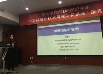 能动学院副院长侯予对中科院理化技术研究所到来的嘉宾表示热烈欢迎,并对获奖学生表示祝贺。侯予教授首先肯定了获奖学生的实力,中科院理化技术研究所是最早进行低温研究的机构,同学们得的理化所冠名的奖学金充分说明了行业对交大学生的认可。同时对同学们提出了要求,要全身心投入到后续的学习和科研工作上,在之后的研究生阶段稳扎稳打,争取更好的成绩。最后代表能动学院欢迎理化所的杰出人才多来做讲座,传经验,共同合作交流,促进低温学科的发展。