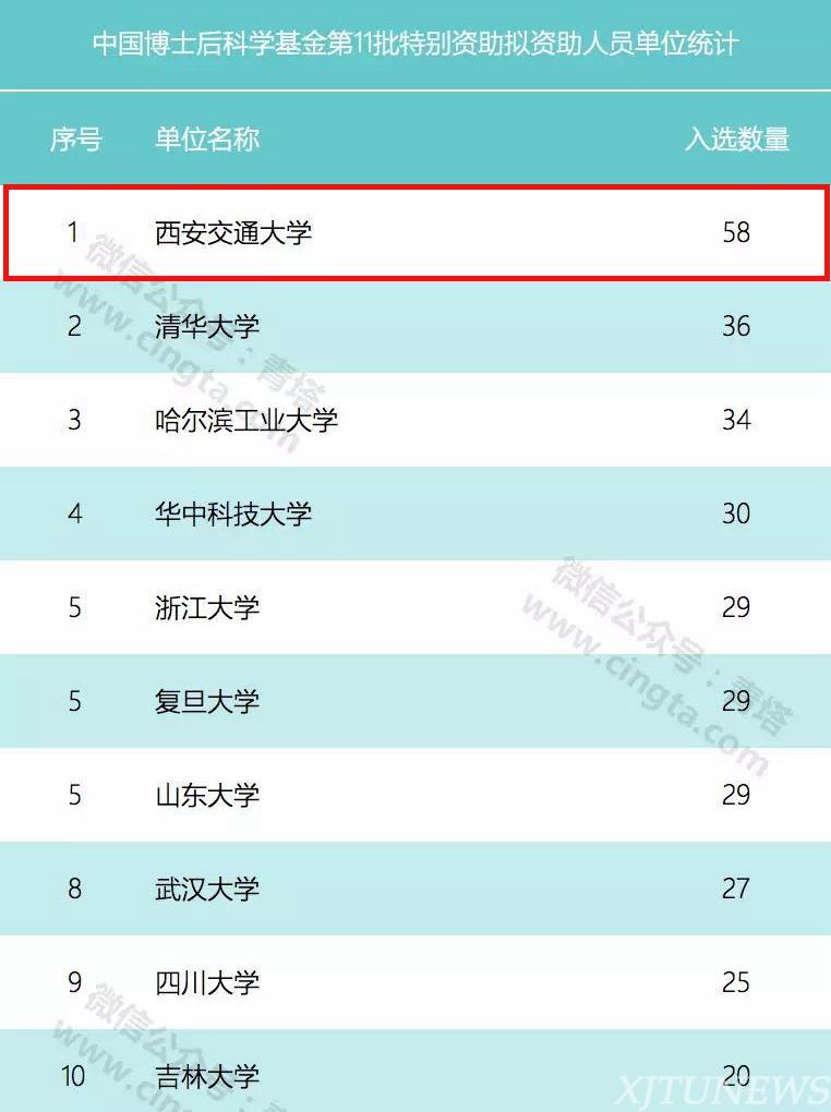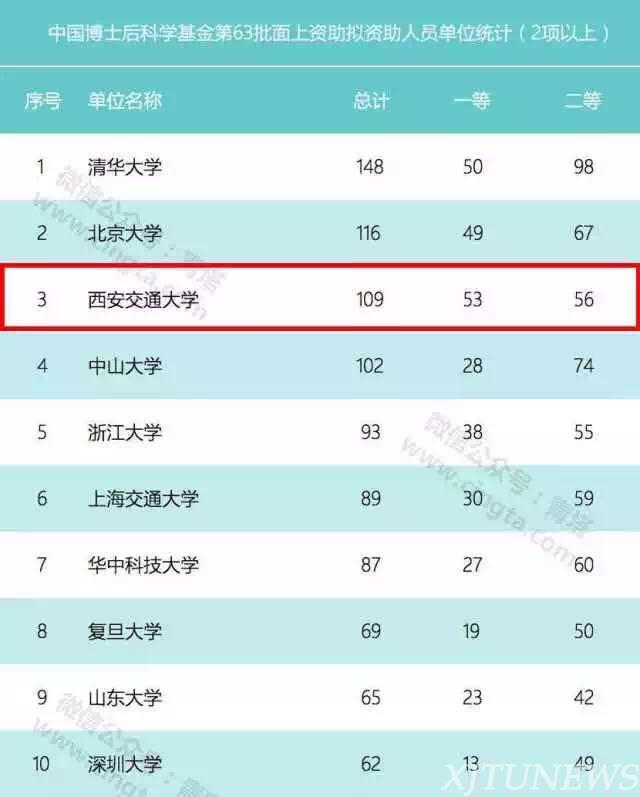 近日,中国博士后科学基金公布了第11批特别资助、第63批面上资助名单,西安交通大学获58项特别资助,位居全国第一,遥遥领先其它高校;获109项面上资助,位居全国高校第三,其中一等资助53项居全国第一。