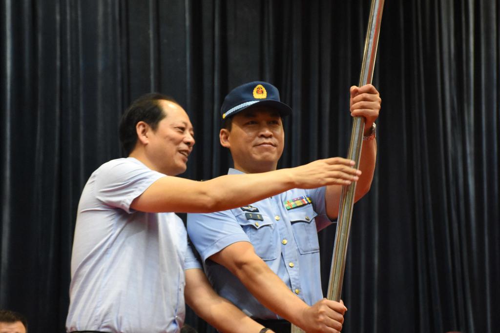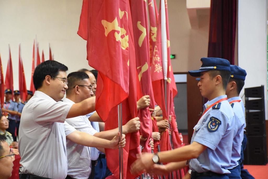 在全体承训官兵和受训新生齐唱国歌后,赵军武宣布2018级学生军训旅成立,并宣布营以上干部名单。随后,程建设向2018级学生军训旅授旅旗,来宾为军训旅各连队授连旗。