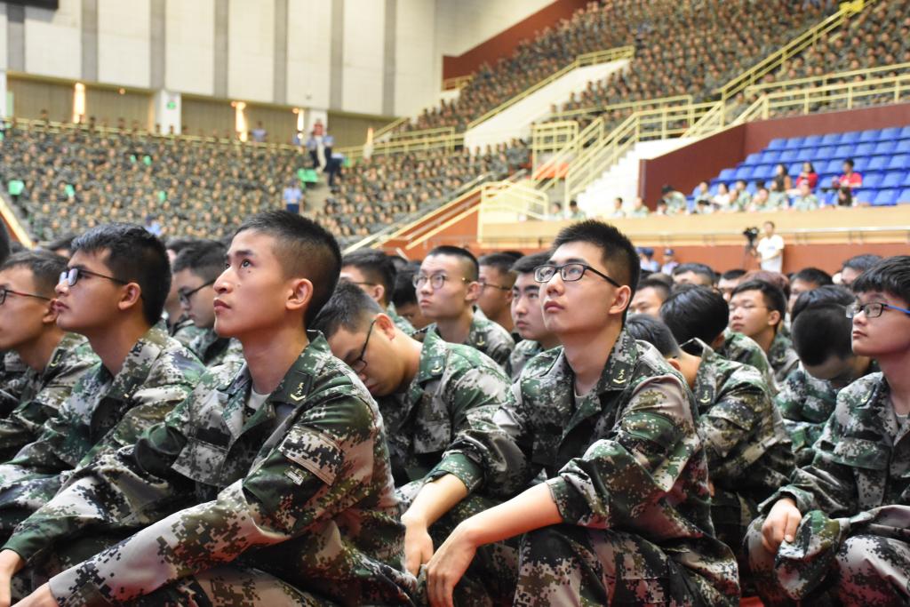 4600余名2018级新生们身着迷彩服,整齐划一地端坐在思源活动中心内,彰显出新一级交大人精神抖擞、朝气蓬勃的崭新风貌。