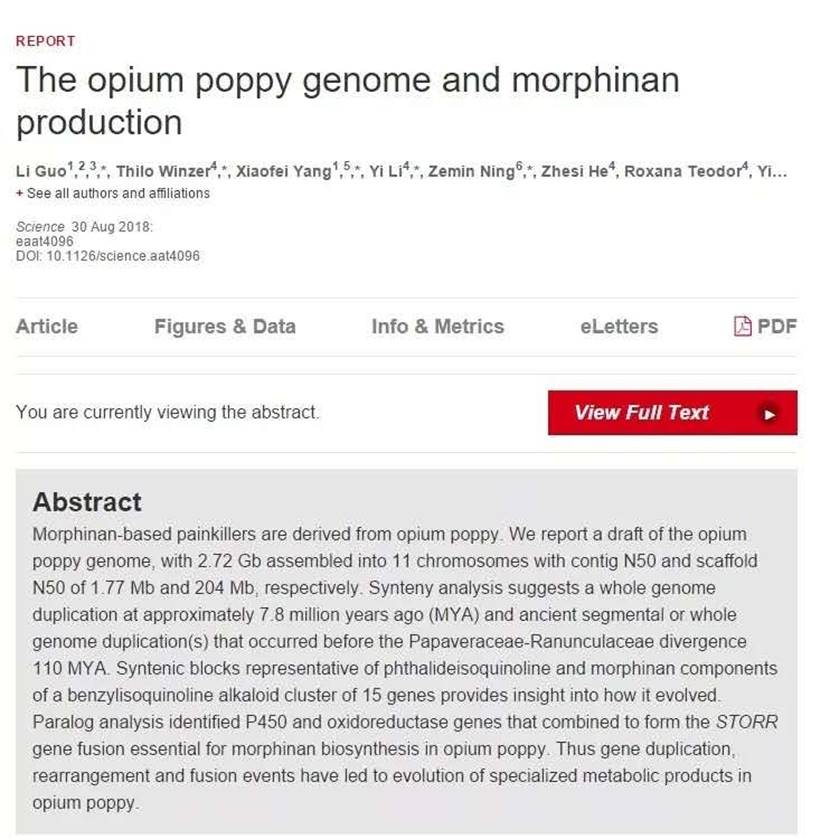 研究显示,罂粟基因组在距今780万年发生了一次全基因组加倍事件,在距今至少1.1亿年发生基因组片段加倍事件。此外,首次发现罂粟合成止咳那可丁和镇痛吗啡类生物碱的15个基因在11号染色体上形成超级基因簇,该基因簇在根、茎部特异表达且共表达。