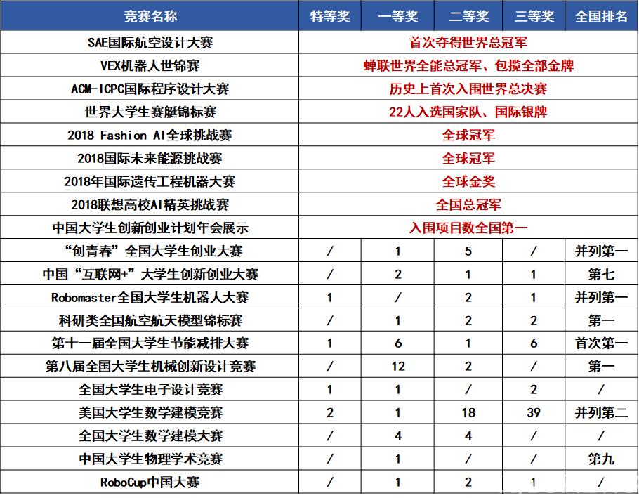 2018年我校参加各类竞赛学生达到10000余人次,并取得了优异成绩,A类竞赛获国家级一等奖及以上奖项41项,较历史最好成绩超出17项。“创青春”全国大学生创业大赛金银奖数量全国第一,学校获得“优胜杯”;中国“互联网+”大学生创新创业大赛获得金奖2项,同时获得了6个单项奖中的“乡村振兴奖”;在航模、机器人、ACM等特色项目中体现国际水准,在SAE国际航空设计大赛中首次以总分第一的成绩勇夺世界总冠军,在VEX机器人世界锦标赛中蝉联全能总冠军并包揽全部金牌,首次入围第42届ACM-ICPC全球总决赛;并在行业影响力较大的创新创业比赛中“多面开花”。