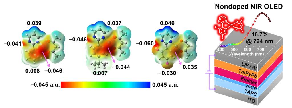 有鉴于此,西安交大理学院化学学科周桂江教授课题组青年教师杨晓龙博士设计合成了一类分子结构简单而发光性能优异的近红外发光材料,并与电信学院吴朝新教授以及材料科学与工程学院马伟教授等团队合作研究了该类材料在近红外OLED中的应用性能及其相关机理。研究发现,通过改变分子结构调控分子的静电势强弱以及分布区域,可以增强分子间的相互作用,进而改善材料的发光性能以及载流子传输性能。以该材料为发光分子,采用真空蒸镀方式制备的非掺杂OLED表现出非常优异的发光性能,最大发射峰波长为724 nm,最大外量子效率达到16.7%。