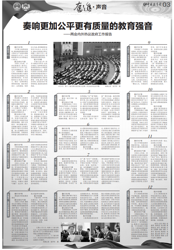 3月6日,《中国教育报》以《奏响更加公平更有质量的教育强音》为题刊发两会内外热议政府工作报告。