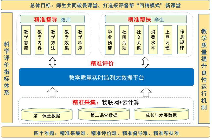 教务处、教发中心、学生处以学校教育教学的现实需求为导向,发现仅靠传统的人工管理方式,学生学习的真实学情难以掌握,教师评价结果时效差、可信度低,跨部门数据很难利用……进而梳理总结出教育教学改革中数据精准采集难、课堂精准评价难、教师精准督导难、学生精准帮扶难四大难题。
