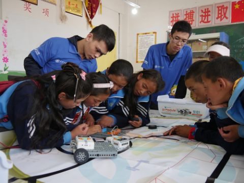 邹域勋和肖超东开设的机器人兴趣课,成为孩子们最喜欢的课堂。每天下午课间后,他们带领10多个孩子分成两个小组,手把手地指导编程、组装、团队协作,并组队PK。当听说,学校的两套机器人教学设备因为时间较长导致程序无法更新时,英仔爱心社积极联系西安一家公司,捐助了两套机器人教学设备。