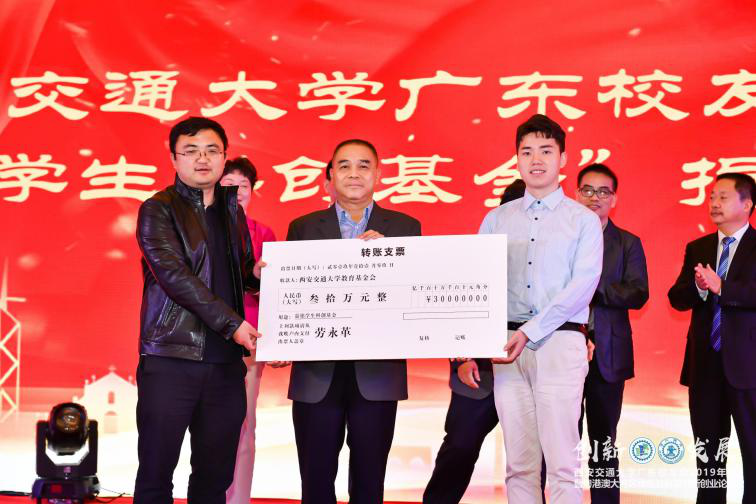 饮水思源,不忘初心。广东嘉铭智能科技有限公司劳永革校友发起的“嘉铭学生科创基金”,首期捐款30万元支持母校学生科创活动。 西安交通大学基金会代表熊鹏、项目执行方西安交通大学团委代表李开贤代表母校接受捐赠,席光副校长为劳永革校友颁发捐赠铭牌。