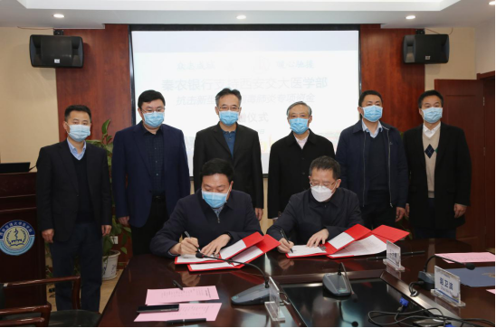 守望相助,共克时艰。2月27日,陕西秦农农村商业银行股份有限公司党委副书记、董事长李彬,党委副书记刘长伟一行来到西安交大医学部,向医学部捐款300万元,专项用于医学部开展新冠疫情科研攻关工作等。此外,秦农银行员工自发捐赠10.4149万元,用于补贴我校赴武汉医疗队生活。我校副校长、医学部主任颜虹,校长助理、医学部副主任吕毅,医学部党工委书记陈腾,我校教育基金会秘书长赵卫滨,医学部副主任贺浪冲、王子明、杨琪出席捐赠签约仪式。