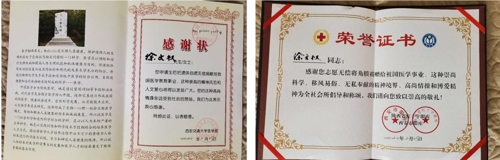 2月25日,在徐文权教授去世的第二天,儿子徐飞带着父亲的遗愿来到交大医学部遗体捐献办公室,据他介绍,捐献遗体,继续为医学教育、医学研究事业做出奉献,这个想法一直存在父亲心里,在75岁经历过一次开颅手术之后,老人就提出了这样的心愿。“奉献”贯穿了徐文权教授的一生,曾经是在实验室和三尺讲台上,去世后,他仍然要奉献于祖国医学事业。在办理遗体捐献手续时,得知省红十字会眼库需要眼角膜,徐飞说:“能更多地服务于社会,我的父亲他一定是愿意的,这本就是他的心愿,作为后辈,我愿意配合和支持,更好完成父亲回馈社会的遗愿,帮助到更多需要帮助的人。”捐献的眼角膜能帮助至少两位患者重见光明,老人的生命也将以另一种形式延续下去。
