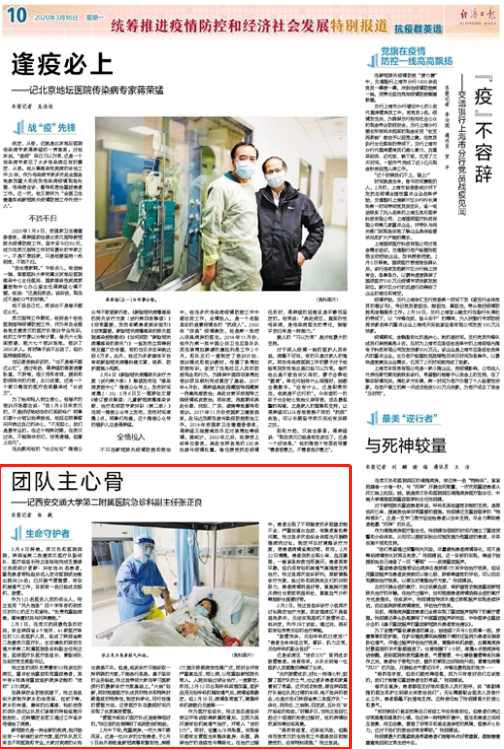 3月4日傍晚,武汉协和医院西院,陕西省第二批援武汉医疗队副领队、医疗组组长张正良刚刚完成支援湖北战疫统计更新:共收治85名患者,重危患者转轻型后送入定点医院或治愈出院共29名;已开展气管插管、有创机械通气工作,目前有一名已经成功脱机、拔管。作为121名医务人员的领头人,张正良用“风大浪急”四个字形容初到武汉时内心的压力和紧张。“负责危重型病患,意味着时刻与死神赛跑。”2月1日,在武汉抗疫最危急的时刻,来自陕西省9个地市、41家医疗单位的121名医护人员,组成了陕西省第二批援武汉医疗队。主动请战的西安交通大学第二附属医院急诊科副主任张正良,担纲医疗队医疗组组长、兼副领队及临时党支部副书记。张正良的团队负责着有50张床位的病区,重点收治重症和危重症患者,其中有4张具有重症监护病房功能的“迷你”ICU病床。