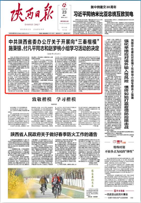 近日,经省委同意,陕西省决定在全省开展向“三秦楷模”施秉银、付凡平同志和赵梦桃小组学习活动,号召全省广大干部群众和各行各业要向“三秦楷模”施秉银、付凡平同志和赵梦桃小组学习,激励全省上下众志成城、共克时艰,为决胜全面建成小康社会、决战脱贫攻坚,夺取疫情防控和实现经济社会发展目标双胜利凝聚起强大精神动力。