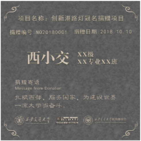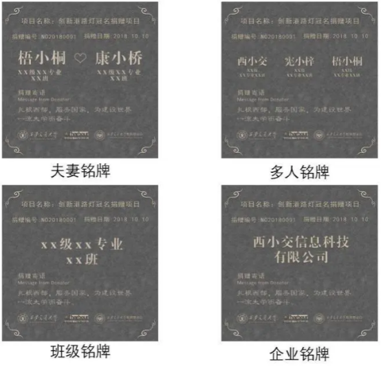路灯冠名捐赠项目铭牌整体色调呈现为静谧灰,辅以铭牌上淡黄色的字体,四个角落的四朵祥云,意为西安交通大学在来自四海的广大校友关注和支持下,弘扬传统,艰苦奋斗,继往开来,铸就辉煌!