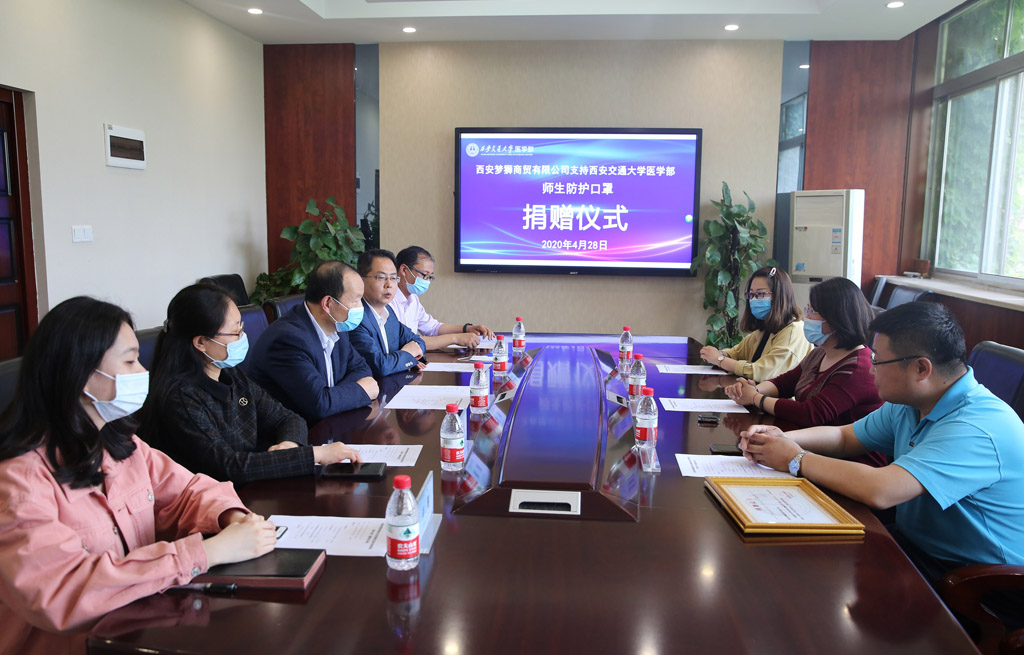 4月28日,西安梦狮商贸有限公司冯丽娟总经理一行三人来到西安交大医学部,为医学部捐赠了一批防护口罩。医学部党工委书记陈腾,综合办公室主任孟晓军、副主任张洁等参加捐赠仪式。
