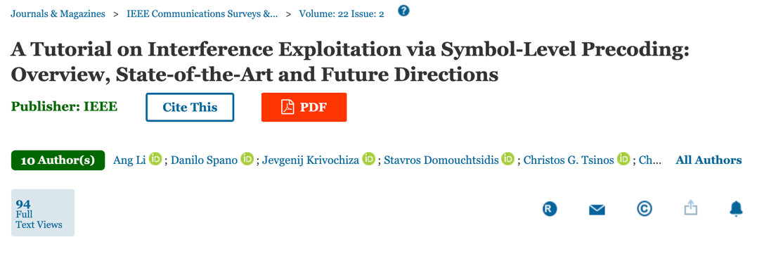 西安交通大学电信学部信通学院李昂教授长期在多天线无线通信系统、符号级预编码及其应用领域开展研究,作为国际上符号级预编码领域的资深研究人员,近期在国际通信领域顶级期刊IEEE Communications Surveys & Tutorials(影响因子22.973)发表学术论文“A Tutorial on Interference Exploitation via Symbol-Level Precoding: Overview, State-of-the-Art and Future Directions”,对基于有益干扰的符号级预编码方案及其在不同无线通信场景中的应用进行了全面阐述,并对该研究领域未来研究方向给出了系列建议。信通学院李昂教授为论文第一作者兼通讯作者,西安交通大学为论文第一作者单位,英国伦敦大学学院、卢森堡大学及澳大利亚悉尼大学为本文合作单位。论文工作得到西安交通大学“青年拔尖人才支持计划”项目和陕西省重点研发计划项目资助。