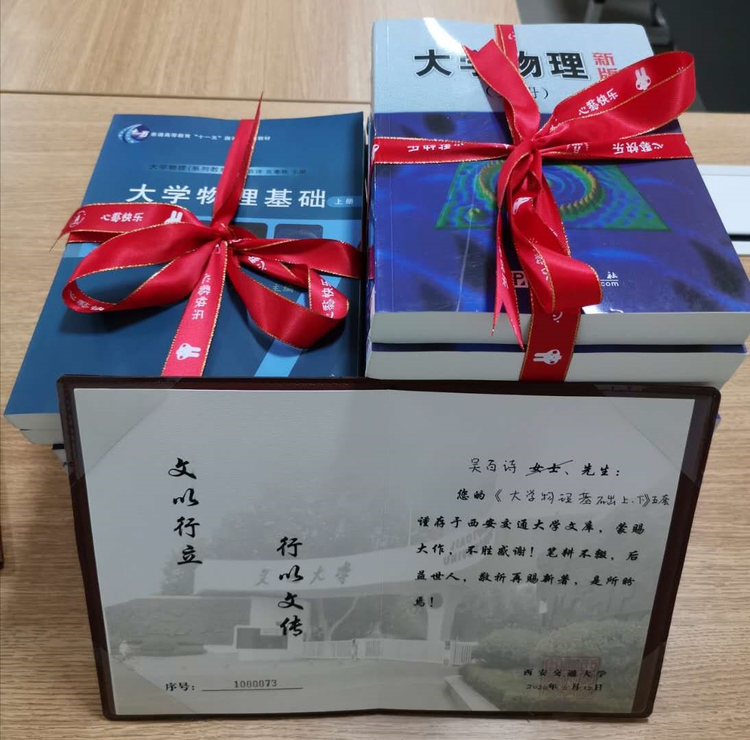 西安六月的天气,时而骄阳似火,时而大雨倾盆,气温和湿度多变,已在养老院和老伴生活有好一段时期的西迁老教授吴百诗先生,在长长一段剧烈的咳嗽之后,语气坚定、铿锵有力地对电话一端的理学院副院长李宏荣教授说:“科学出版社加印了我的两套《大学物理》教材,他们要送样书给我,我请物理教研室把这些书代我捐赠给学校图书馆,虽然有些微不足道,希望能够为学校的教育发展多尽一份力量”。老先生捐书的意愿源于对教学工作的热爱,对高等教育事业发展的殷切关怀,他用实际行动勉励后辈要不忘初心,牢记使命,努力做好教育教学工作,做有情怀的教育工作者。