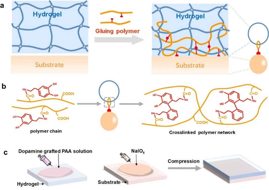 针对这一问题,西安交通大学航天航空学院软机器实验室卢同庆教授及高扬博士提出水凝胶通用粘接的概念。研究团队以聚丙烯酸接枝儿茶酚形成的长链聚合物作为胶水,简单方便地使多种水凝胶与多种材料(玻璃、金属、塑料、弹性体、生物组织)形成有效粘接。作为胶水的聚合物溶液可以扩散到水凝胶网络中,带有儿茶酚的聚合物长链在氧化剂的触发下发生交联,原位形成的聚合物网络像“分子缝线”一样与水凝胶网络拓扑缠绕在一起,同时聚合物链上的儿茶酚又可以通过各种相互作用与不同基底材料(玻璃、金属、塑料、弹性体、生物组织)键合,从而产生强韧粘接,其粘接能高达200-400J/m2。这一研究不仅为水凝胶粘接提供了一种方法,同时极大简化了柔性器件和可穿戴设备中的异质材料组装问题,并且在医学和工程应用中具有巨大的潜力。