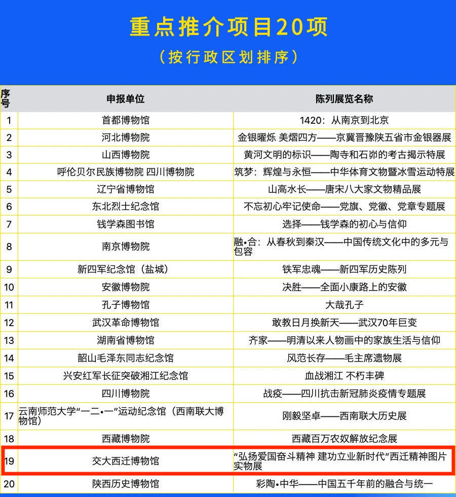 近日,国家文物局发布了100项2020年度“弘扬优秀传统文化、培育社会主义核心价值观”主题展览推荐项目,其中重点推介展览20项。交大西迁博物馆“弘扬爱国奋斗精神 建功立业新时代——西迁精神图片实物展”入选重点推介项目,此展与陕西历史博物馆的彩陶文化展一起,成为陕西省两个入选的重点推介项目。