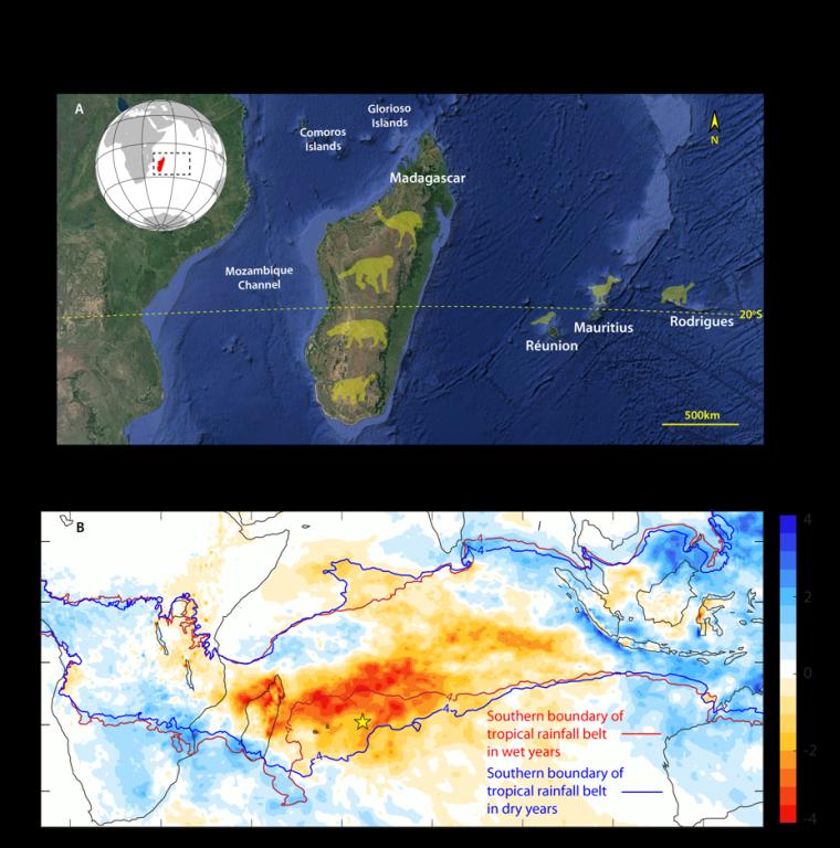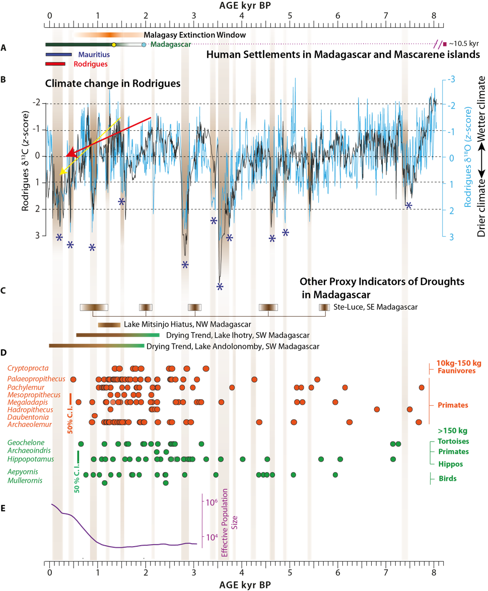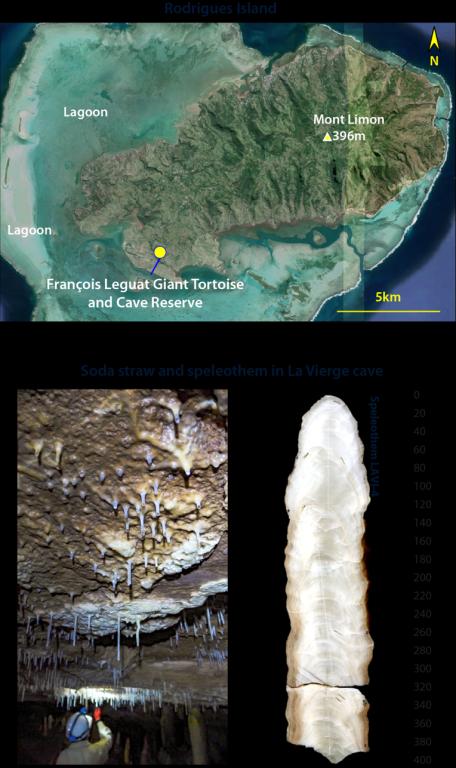 研究人员利用马达加斯加以东约1600km的罗德里格斯岛La Vierge 洞穴的石笋,重建了过去8000年以来高分辨率、精确定年的古气候记录。该岛屿远离东非大陆深入海洋内部,人类发现它的时间要远远晚于马达加斯岛大型动物灭绝的时段。