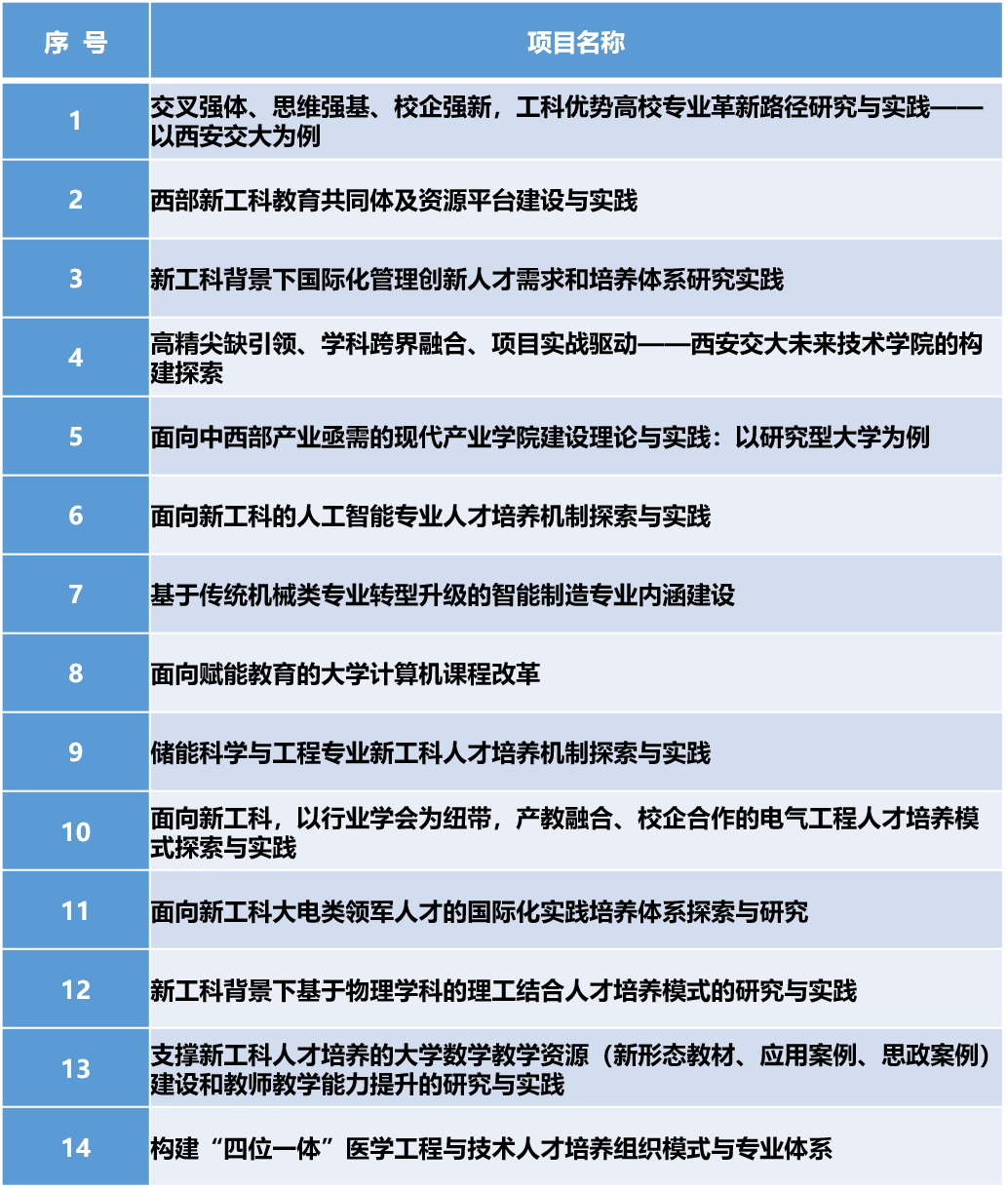 日前,教育部公布了第二批新工科研究与实践项目认定名单,西安交大共有14个项目获批立项,项目总数居C9高校第一、全国高校第二位。学校在教育部限额推荐3项的条件下,精心筹划、组织动员,同时充分利用优质资源,积极努力拓宽申报渠道,通过教指委和行业协会学会等,成功获得14个推荐资格并全部获批。
