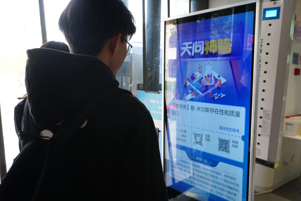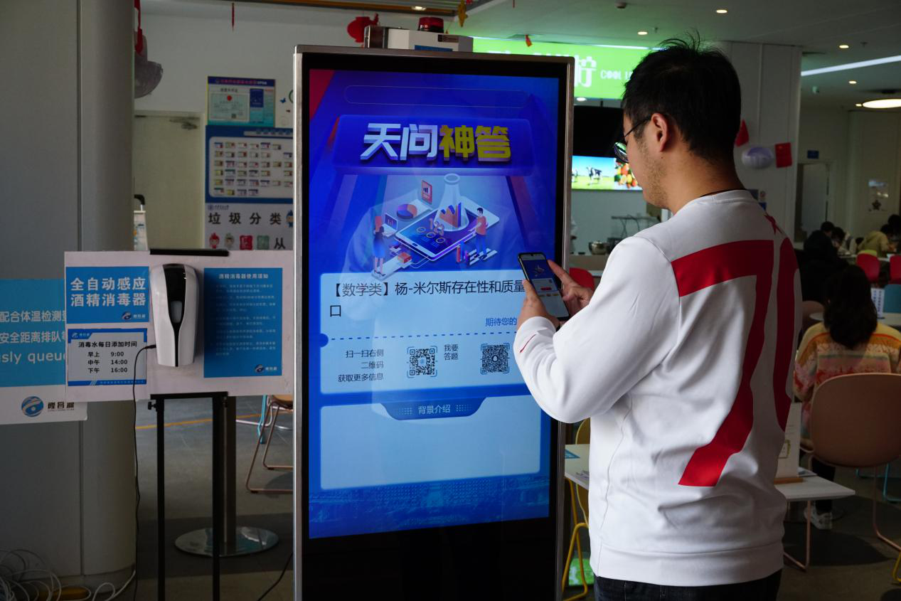11月3日,“天问神答”系统正式上线。上线首日,系统发布数学类科学难题—杨米尔斯存在性和缺口问题。创新港和鸣苑、惠风苑、朗清苑三个餐厅门口皆安放大屏幕,对“天问”和“神答”进行实时发布,向世界展示交大人的精神境界和科学素养,为人类文明的进步事业提供交大方案,贡献交大智慧。