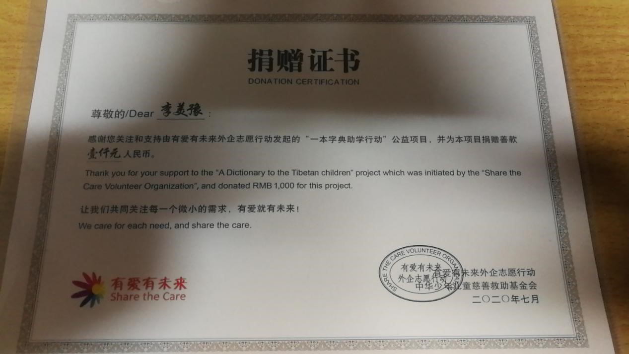 李美豫一直希望通过全国性的优质志愿项目把自己对于弱势群体,尤其是弱势儿童的关心和关怀传递到更远的地方。“我有一个藏族室友,她帮助我了解到了很多藏族文化和藏族故事。”李美豫说。当她看到“一本字典小课堂--为青海省玉树州治多县及杂多县藏族学生捐赠汉藏字典”项目后,李美豫特别愿意借助项目的力量将自己对藏族学生的关心以书籍的方式传递到玉树,希望能够给这些孩子送去知识和关怀,以及接受更好教育的机会。李美豫表示,也特别希望自己能为汉藏友谊和民族团结做出一份贡献,于是她将自己在第二届“公益之星”比赛中获得的部分奖金捐赠到这个项目中。