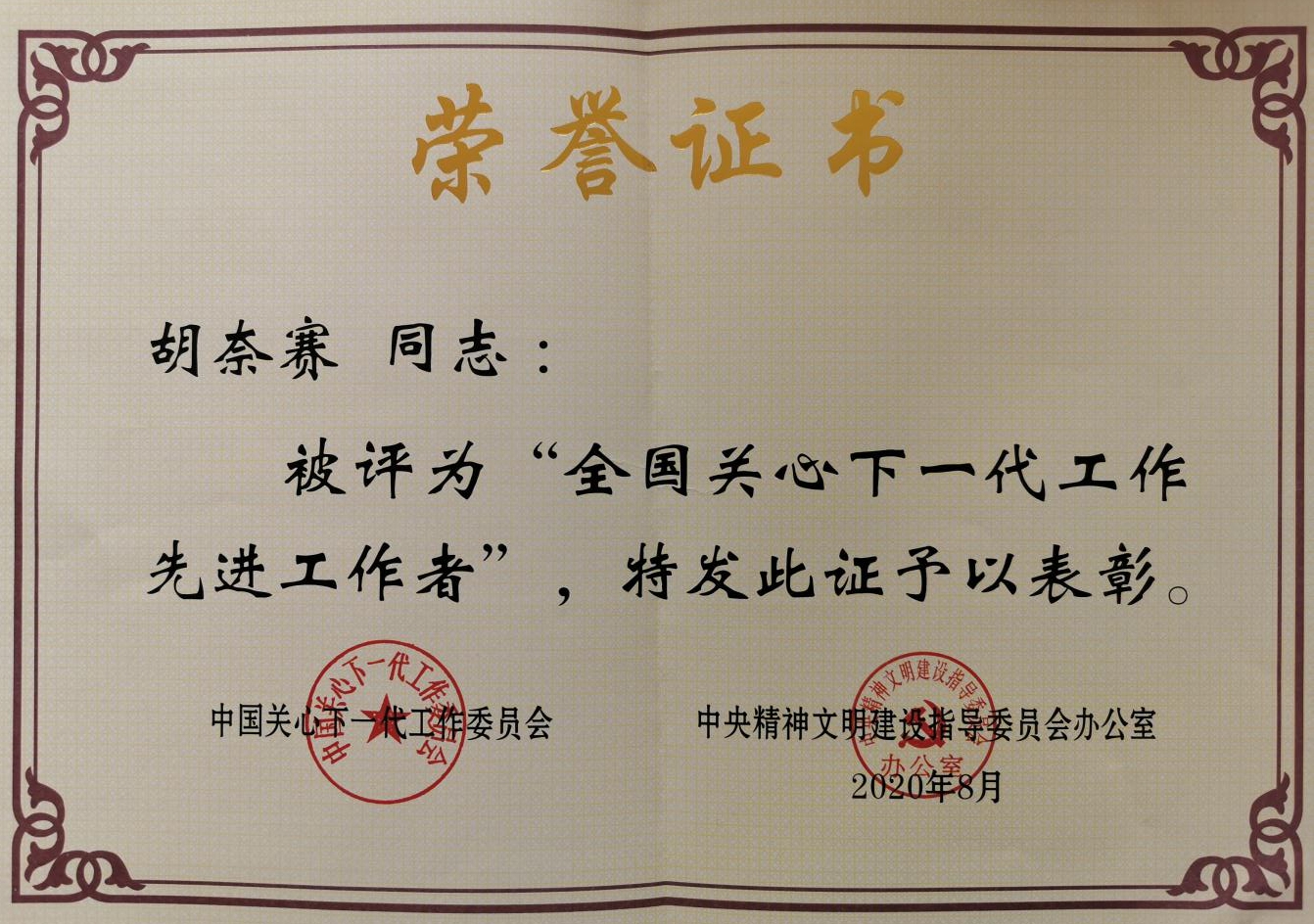 胡奈赛,1934年生,汉族,中共党员,西安交通大学材料学院退休教授,1957年随交通大学西迁。自1994年退休至今,以耄耋高龄仍坚持在关心下一代工作一线、立德树人工作一线,充分发挥西迁亲历者、建设者优势,阐述西迁精神,讲述西迁故事,为引导青年知识分子大力弘扬爱国奋斗精神,教育广大青少年听党话跟党走,树立正确人生观、价值观、世界观持续贡献着属于老一辈西迁人的光和热,为学校关心下一代工作作出了突出贡献。