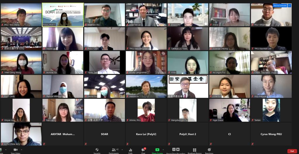 1月29日,2019-2020丝绸之路翱翔青年领袖计划项目举行在线结业典礼。香港理工大学服务学习及领导才能发展处处长魏恩恩、高级主任欧羡雪、顾问陈志辉,北京大学港澳台办副主任谷雪,西安交大教育基金会秘书长赵卫滨,港澳台办主任贺长中、副主任韦学勇参会。
