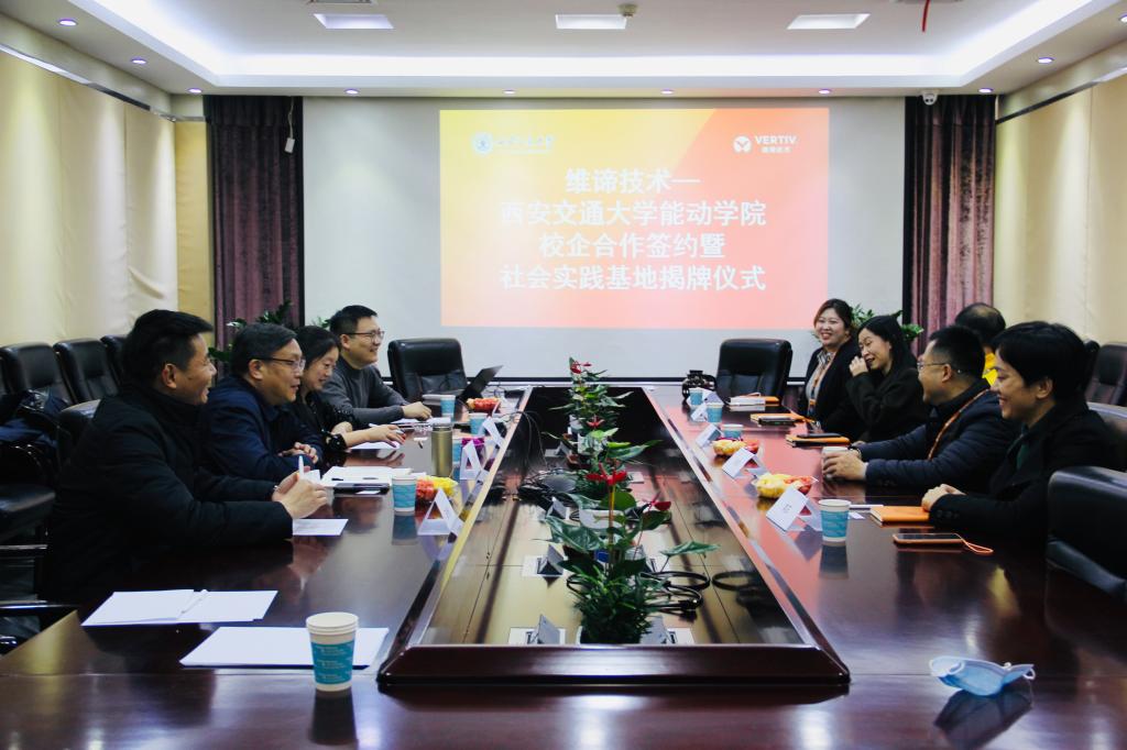 1月6日下午,西安交通大学能动学院与维谛技术(西安)有限公司举行社会实践基地签约共建仪式。能动学院党委书记何茂刚,党委副书记韦娜,校团委副书记石杨根,能动学院团工委书记崔俊晨以及维谛技术(西安)有限公司总裁代表冯晓波,高级总监马丽强,总监姜涛、樊蕊共同参加基地共建仪式。