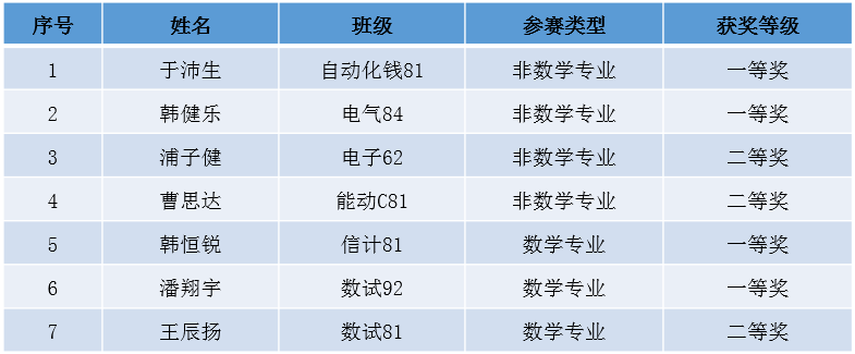 西安交大8名同学参加决赛,其中非数学专业4名,数学专业4名,共获得非数学专业组一等奖2项、二等奖2项,数学专业组一等奖2项、二等奖1项。特别是,自动化钱81班于沛生同学、电气84班韩健乐同学分别获得非数学专业组全国第一、全国第六的优异成绩。