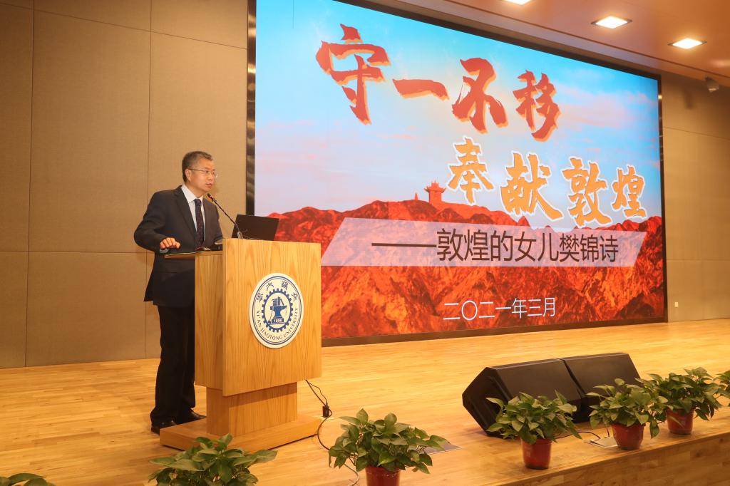 敦煌研究院保护研究所所长郭青林作《守一不移奉献敦煌——敦煌的女儿樊锦诗》报告,他用质朴的语言、生动的事例和真挚的情感,讲述了敦煌研究院名誉院长樊锦诗保护、研究、弘扬敦煌文化遗产的动人故事。樊锦诗获2020年何梁何利基金“科学与技术成就奖”,她在敦煌文物研究所(敦煌研究院前身)工作58年,长期从事石窟考古、石窟保护与管理等方面的研究,为敦煌石窟的保护、研究、弘扬事业奉献了一生的心血和精力。她倡导、主持“敦煌莫高窟保护利用工程”,开创了敦煌莫高窟开放管理新模式,培养了一批敦煌石窟保护和管理人才,极大地提高了敦煌石窟科学保护和管理的现代化水平。