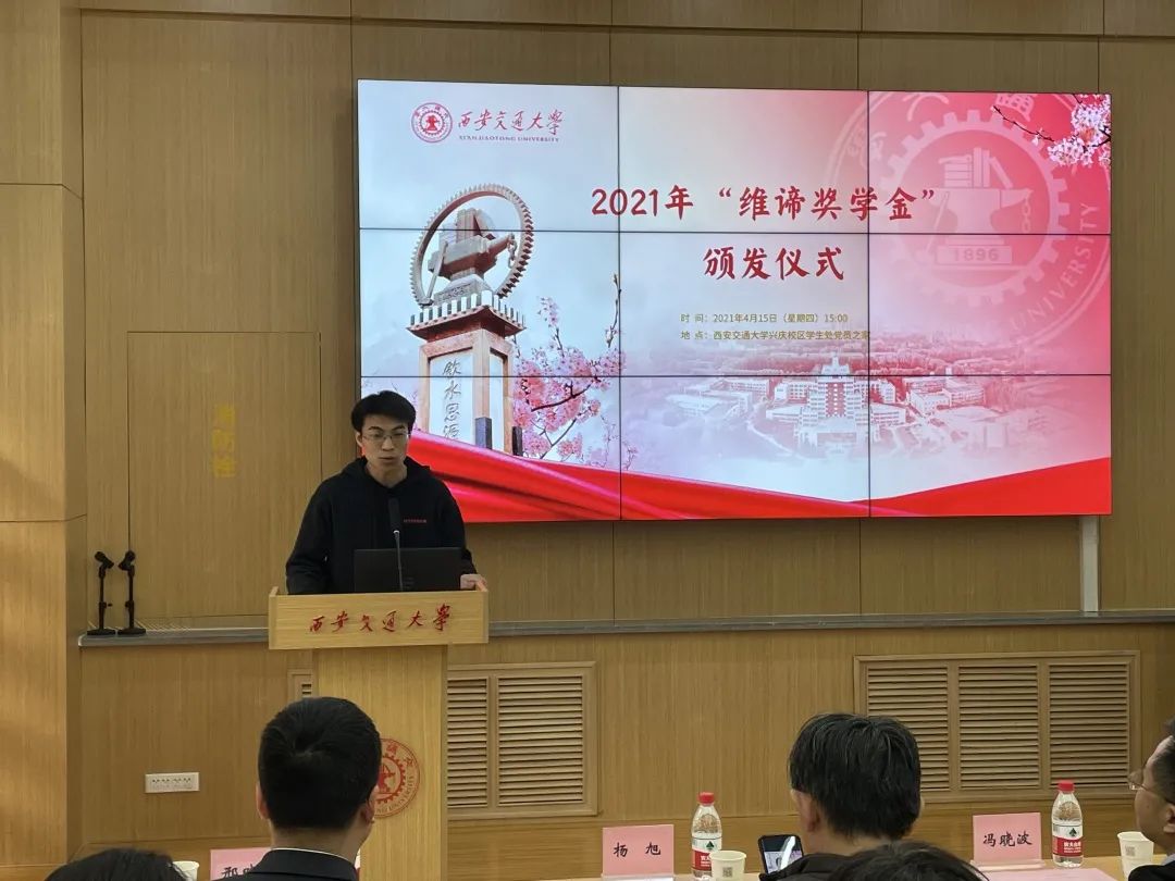 来自能动学院的戴高峰同学和来自文治书院的裴逸璇同学作为获奖学生代表依次发言,表达了获奖学生对维谛技术(西安)有限公司衷心的感谢。他们表示作为获奖者将发扬交大人精勤求学、敦笃励志、果毅力行、忠恕任事的精神,为建设祖国而砥砺奋斗,争做西迁精神新传人。