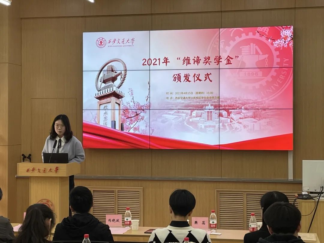4月15日下午,2021年“维谛奖学金”颁发仪式在学生处党员之家举行。维谛技术(西安)有限公司总裁代表冯晓波、人力资源总监樊蕊、招聘总监周蓉,西安交通大学教育基金会副秘书长邢晓强、电气学院副院长杨旭、能动学院副书记韦娜、电信学部办公室主任黄文等领导嘉宾及全体获奖学生参加了颁发仪式。会议由西安交通大学学生处副处长、资助中心主任张丹主持。