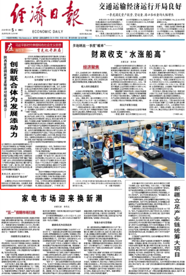 5月5日,《经济日报》头版刊发《陕西促进创新要素精准对接高效耦合——创新联合体为发展添动力》一文,报道陕西省打造创新联合体,指出促进创新要素精准对接、高效耦合,以创新联合体为“反应釜”的“两链”融合行动,为追赶超越增添新动力。