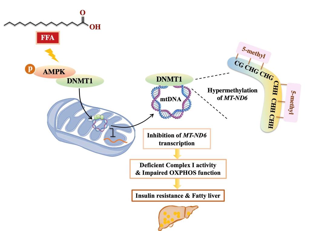 近日,西安交通大学生命学院线粒体生物医学研究所刘健康教授、冯智辉教授团队、医学院臧伟进教授团队以及空军军医大学高峰教授团队等密切合作,从线粒体DNA甲基化调控线粒体稳态入手,在线粒体表观遗传学参与胰岛素抵抗机制方面取得重要进展。该研究发现,细胞内游离脂肪酸的升高能够通过激活腺苷酸活化蛋白激酶(AMPK)促进DNA甲基转移酶DNMT1的线粒体转位,进一步特异性地诱导线粒体DNA编码的呼吸链复合物Ⅰ关键基因MT-ND6的高甲基化,造成MT-ND6的转录抑制与线粒体氧化磷酸化受损,最终导致胰岛素抵抗的发生。该研究从线粒体表观遗传学的新角度揭示了线粒体稳态失衡参与胰岛素抵抗形成的分子机制,为2型糖尿病的防治提供了新的干预靶点和防治策略。论文评委认为“这一发现是线粒体基因调控和代谢疾病领域的一个里程碑”。