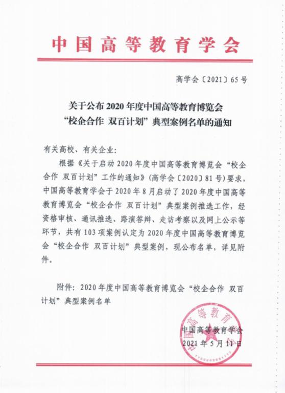 中国高等教育学会于2019年首次启动中国高等教育博览会“校企合作 双百计划”典型案例推选工作,旨在为高校和企业搭建合作的桥梁,推广创新产教融合、校企合作模式,交流、深化和复制成功经验,形成示范辐射带动效应。2020年度 “双百计划”典型案例推选于去年8月启动,共征集285家单位申报的670项案例,历时10个月,经过资格审查、通讯推选、路演答辩、双走访考察等环节,共有103项案例被认定为2020年度中国高等教育博览会“校企合作 双百计划”典型案例,“京博N1N基地案例”荣列其中。