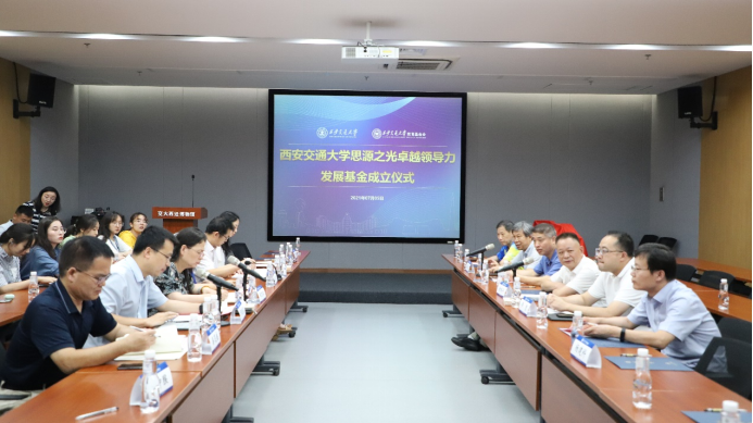 7月5日下午,西安交通大学思源之光卓越领导力发展基金成立仪式及《青年领导力》教材发行仪式顺利举办。西交智谷(厦门)科技有限公司董事长兼CEO、西安交通大学思源之光卓越领导力发展基金发起人谢鸿年,校友代表王全民、温灵生,西安交通大学学生就业创业指导服务中心主任郑旭红,交大党委宣传部副部长、出版社党总支书记李重,校友会秘书长、西安交通大学校友智库、《青年领导力》副主编赵力等学校相关部门代表、彭康书院学生代表出席活动。教育基金会副秘书长邢晓强主持仪式。