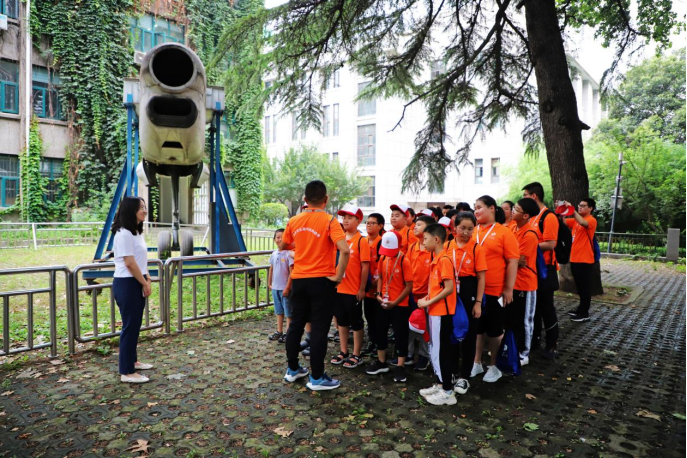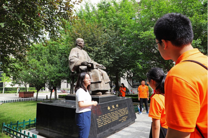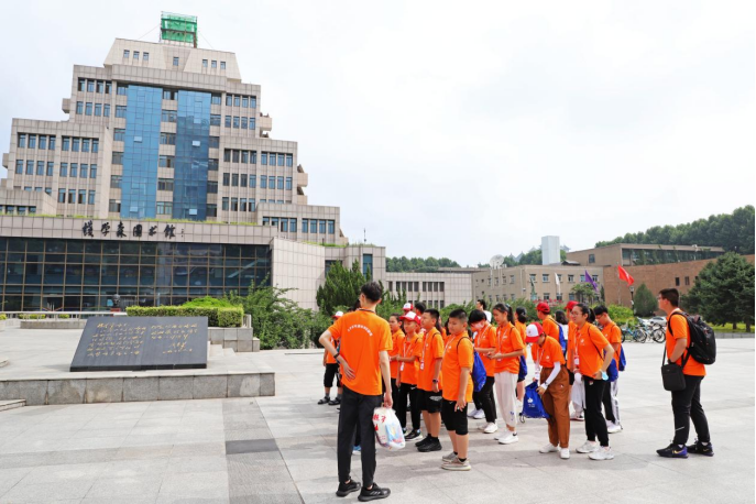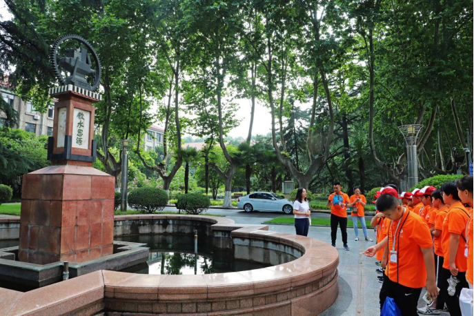 仪式后,全体营员一起合影留念,并开启第一天的研学之旅。带队老师带领来访学子们走访了西安交通大学校史遗迹和标志性建筑,从南洋公学的创始人、交通大学第一任校长盛宣怀讲起,途经四大发明广场、钱学森图书馆、航天学院、东花园唐文治校长和叶恭绰校长雕像、西花园彭康校长雕像,最后前行至西安交通大学标志性建筑——腾飞塔,教育基金会志愿者从历史发展、价值意义等多个方面为学子们讲述了西安交通大学的建设与发展故事。