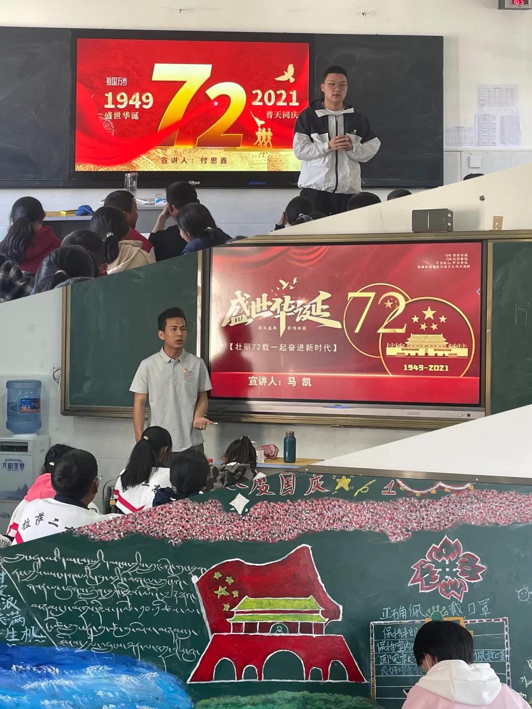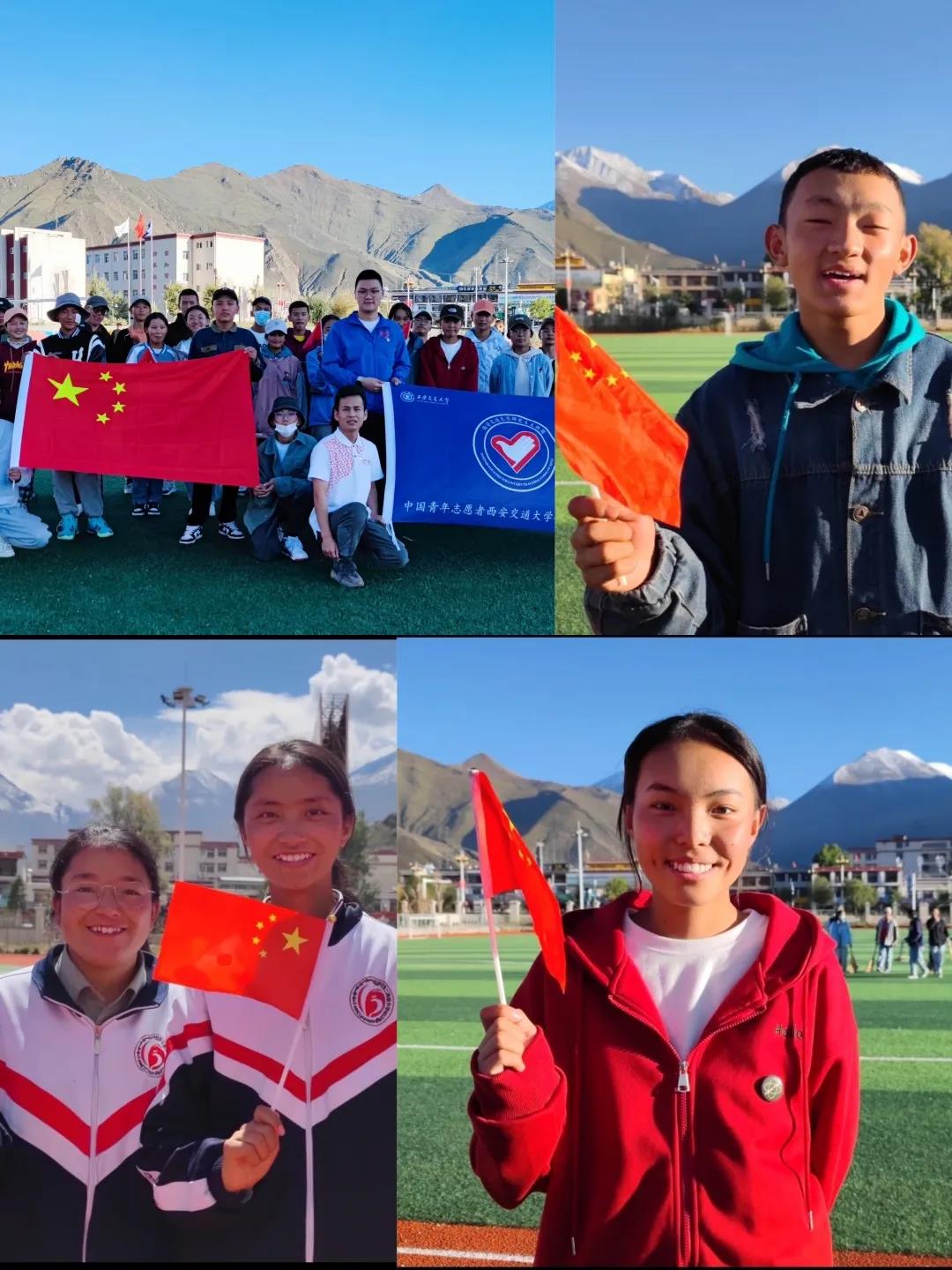 同时,志愿者们引导同学开展“我和国旗合个影”“黑板报中的爱国情”等庆祝活动。同学们承诺要做坚定的爱国者,把“老西藏精神”与西迁精神结合,继承革命事业并且发扬光大,坚定维护祖国统一,努力学习科学文化知识,为建设社会主义新西藏积累过硬的本领,打下坚实的理论功底。